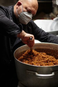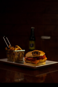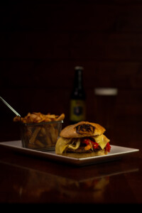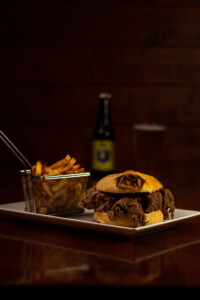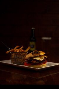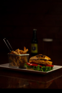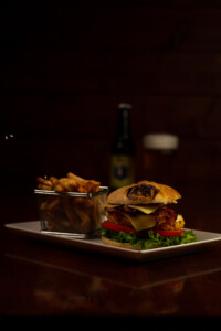 Essendo uno shooting focalizzato a delle campagne social, quindi caratterizzati da una fruizione molto veloce, occorreva creare immagini che fossero molto contrastate e sature, in modo da attirare lo sguardo dello spettatore. Per fare questo abbiamo ricavato all’interno del locale un piccolo set, utilizzando il legno dei piani, in modo da richiamare lo stile della sala, su cui siamo andati ad inserire i vari piatti. Sullo sfondo abbiamo posizionato poi alcune birre artigianali della casa, con il medesimo logo quindi, utilizzando birre bionde o scure i base al miglior accostamento con il piatto.